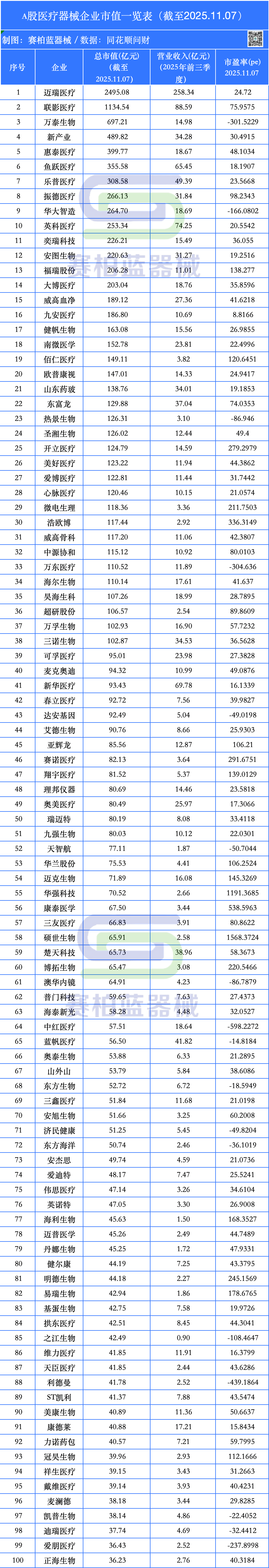 100家A股器械企业市值排行