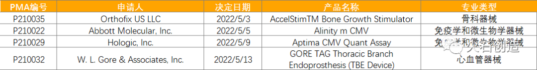 2022年5月有4个通过上市前批准(PMA)途径首次上市的产品,见表4。