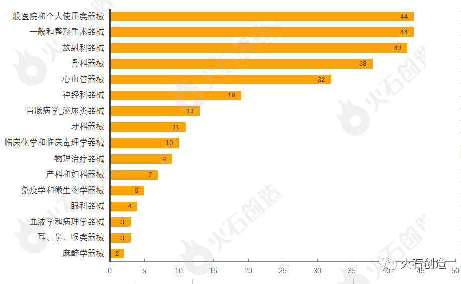 通过对510(k)上市前通知的器械根据美国医学专业用途进行分类,结果发现,5月产品获批类型最多的为一般医院和个人使用类器械、一般和整形手术器械、放射科器械、骨科器械与心血管器械,见图4。