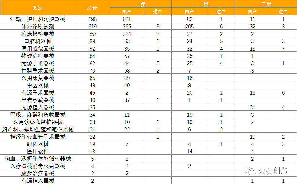 统计数据显示,注输、护理和防护器械数量最多,共696项,占27.81%,基本上均为国产,为694项。除注输、护理和防护器械,批准注册类别数量排前三位的分别为体外诊断试剂,临床检验器械和口腔科器械。
