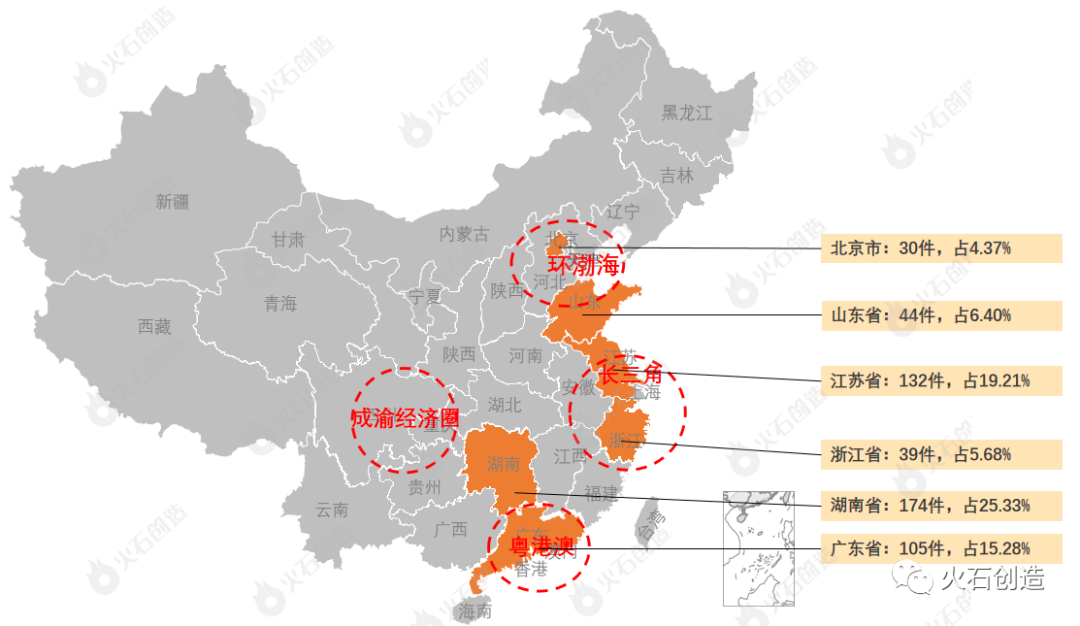 从地域分布上,2022年5月国产二、三类注册产品批件最多的依次为湖南省(174件)、江苏省(132件)、广东省(105件)三个区域,见图5。