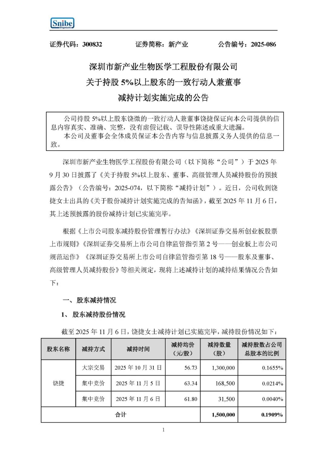 2025年11月7日,新产业生物发布公告称,公司持股5%以上股东饶微的一致行动人兼董事饶捷已完成此前披露的股份减持计划。