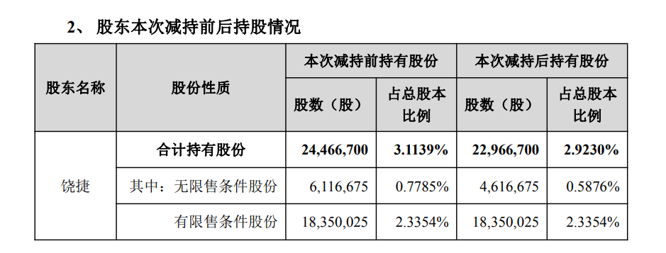 据公告,饶捷通过大宗交易及集中竞价方式累计减持公司股份150万股,占公司总股本的0.1909%,减持计划实施完毕。
